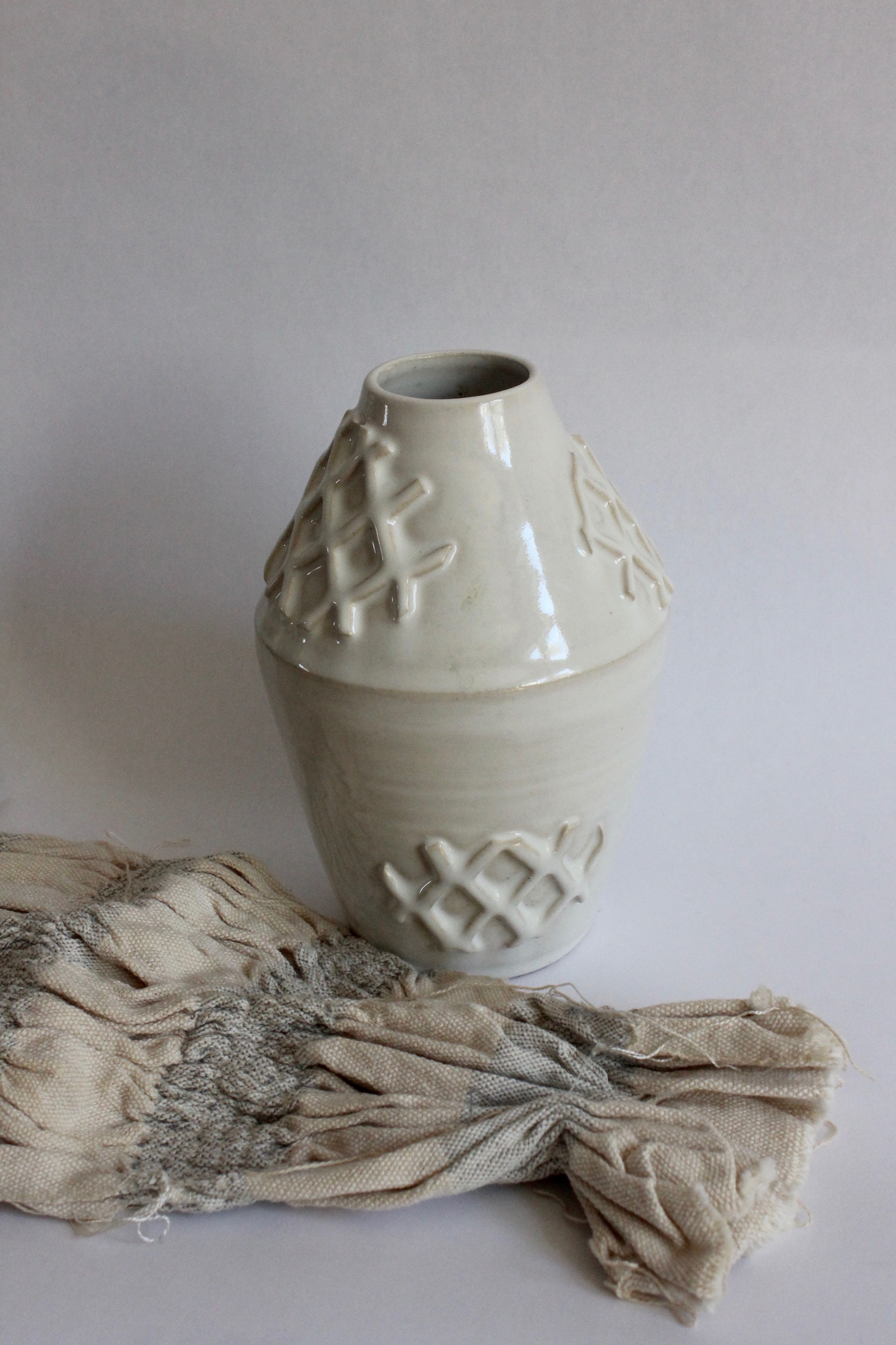 Clay, glaze, underglaze, handwoven cloth